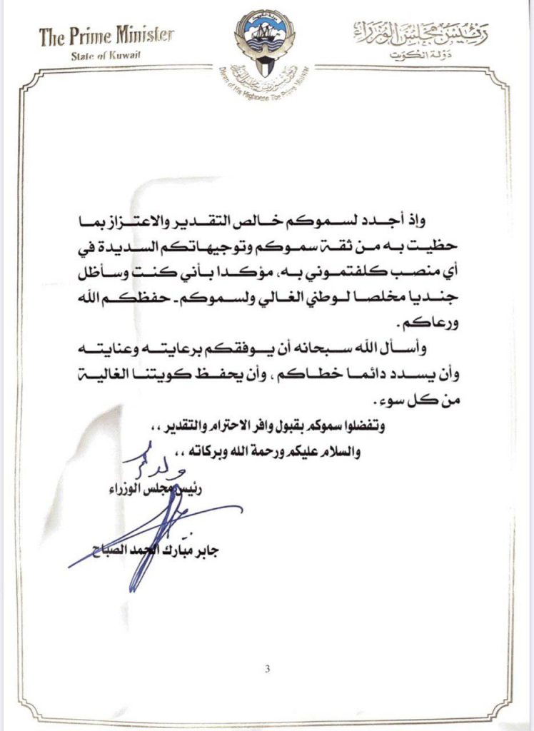 سمو الشيخ #جابر_المبارك يرفع إلى مقام سمو الأمير كتاب اعتذار عن تعيينه رئيساً لمجلس الوزراء