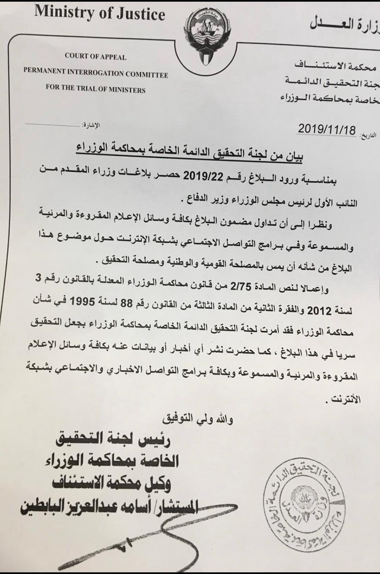وأوضحت اللجنة أنه نظراً إلى أن تداول مضمون البلاغ بكافة وسائل الإعلام المقروءة والمرئية والمسموعة وفي برامج التواصل الاجتماعي بشبكة الانترنت حول موضوع هذا البلاغ من شأنه أن يمس بالمصلحة القومية والوطنية ومصلحة التحقيق ، وإعمالا لنص المادة 57/2 من قانون محاكمة الوزراء المعدلة بالقانون رقم 3 لسنة 2012 والفقرة الثانية من المادة الثالثة من القانون رقم 88 لسنة 1995 في شأن محاكمة الوزراء ، فقد أمرت لجنة التحقيق الدائمة بجعل التحقيق سرياً في هذا البلاغ ، كما حظرت نشر أي أخبار أو بيانات عنه بكافة وسائل الإعلام المقروءة والمرئية والمسموعة وبكافة برامج التواصل الاخباري والاجتماعي بشبكة الانترنت .