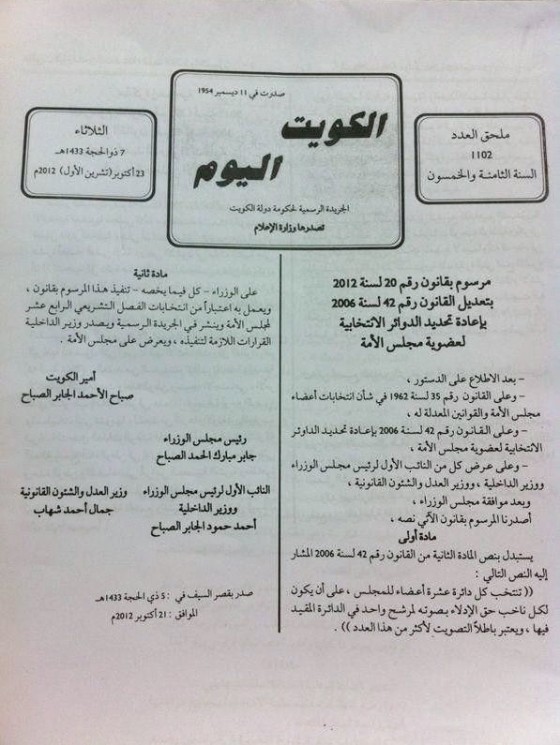 صدر في يوم الثلاثاء 23-10-2012 مرسوم ضرورة مُوقع من صاحب السمو أمير البلاد الشيخ صباح الأحمد لتقليص عدد أصوات الناخب من 4 أصوات إلى صوت واحد فقط ونُشر في الجريدة الرسمية .. ويُذكر أنه خرجت مسيرة شعبية حاشدة تعارض هذا المرسوم بسبب عدم دستوريته تفاصيل اكثر هنا .. وأيضاً خرج بيان من قوى المعارضة رداً على هذا المرسوم هنا