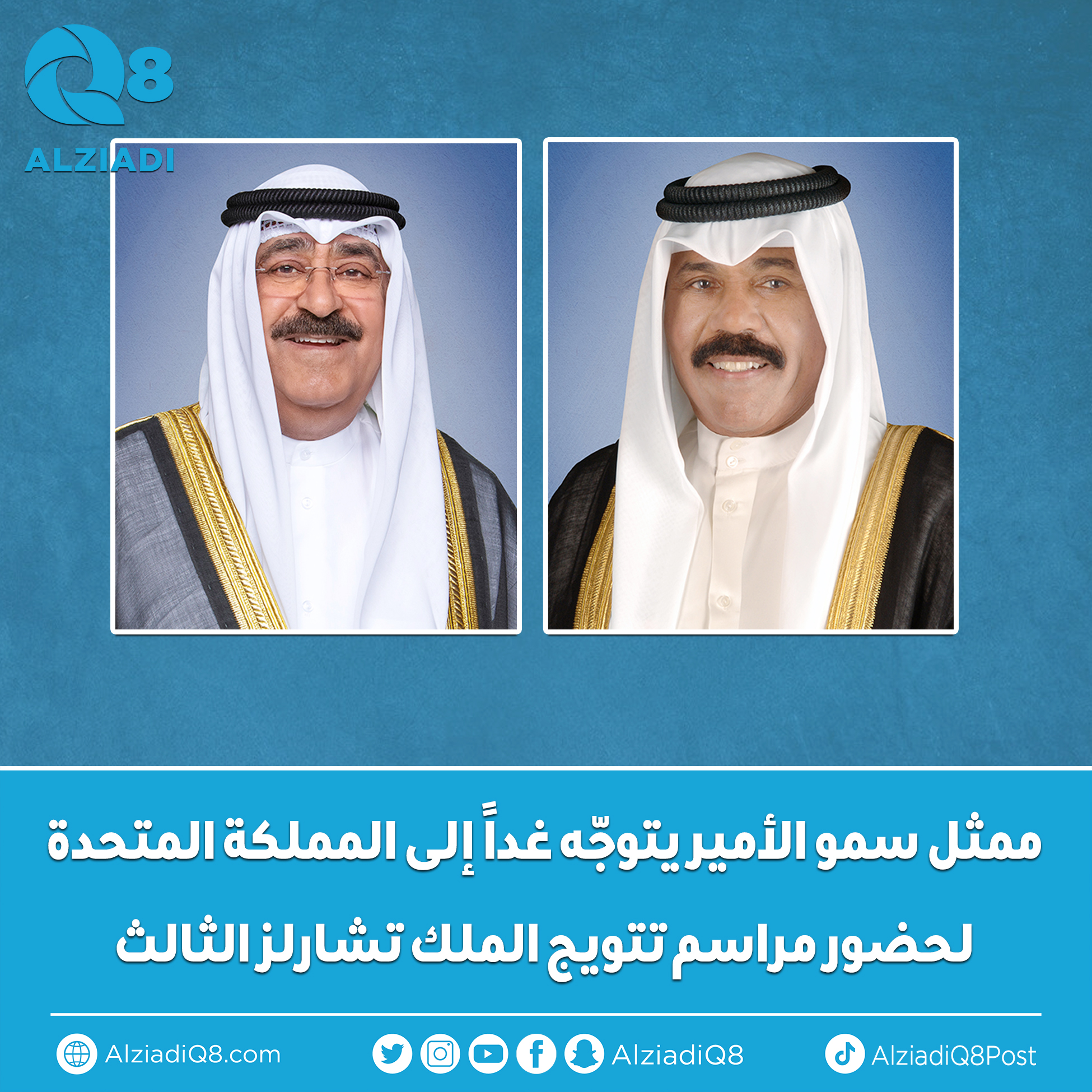 (كونا) – بحفظ الله ورعايته يغادر ممثل صاحب السمو أمير البلاد الشيخ نواف الأحمد سمو ولي العهد الشيخ مشعل الأحمد، والوفد الرسمي المرافق لسموه أرض الوطن غداً الخميس، متوجها إلى المملكة المتحدة الصديقة، وذلك لحضور مراسم تتويج صاحب الجلالة الملك تشارلز الثالث ملك المملكة المتحدة لبريطانيا العظمى وإيرلندا الشمالية الصديقة.