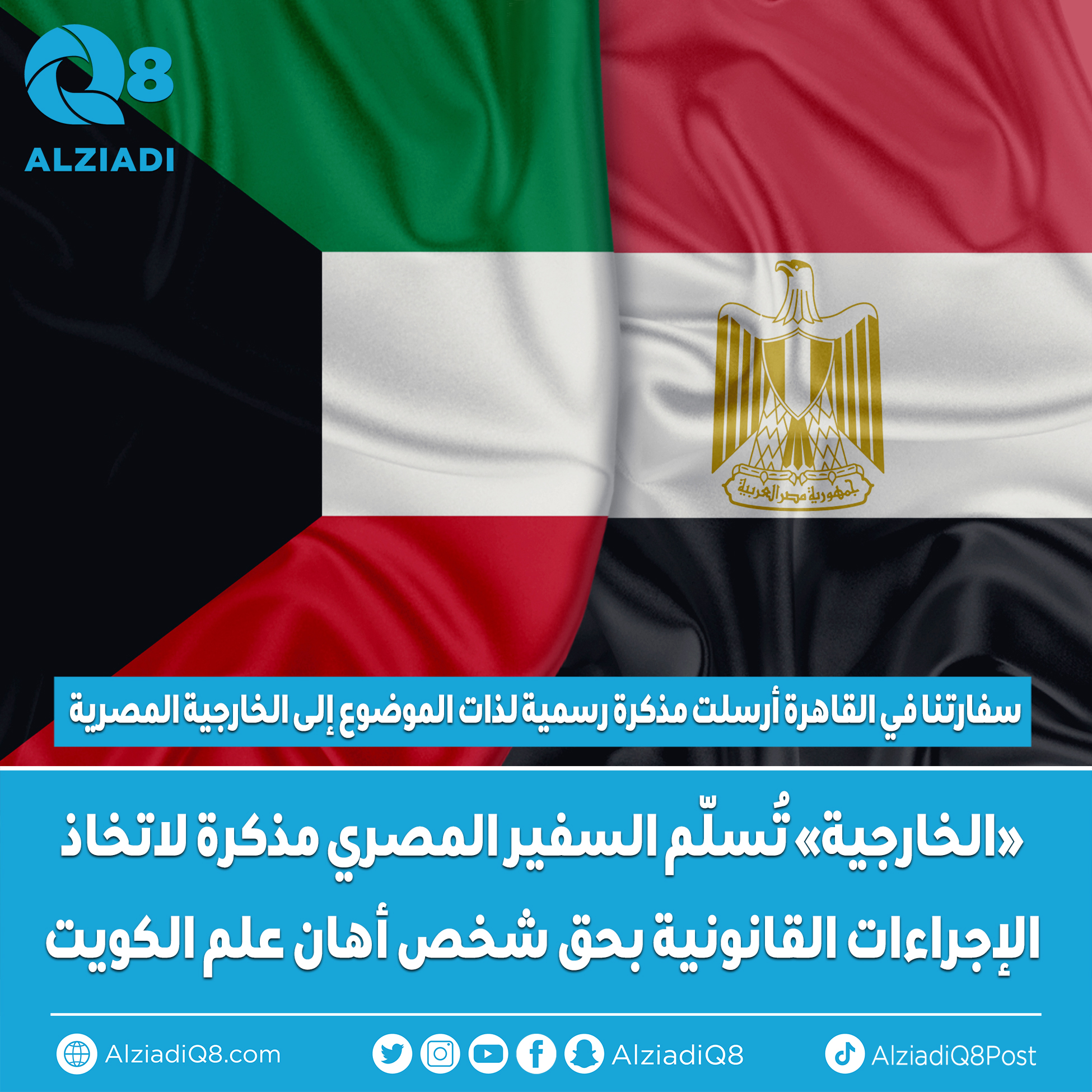 (كونا) – بناء على توجيهات من وزير الخارجية الشيخ سالم عبد الله الصباح التقى مساعد وزير الخارجية لشؤون الوطن العربي السفير أحمد البكر بسفير جمهورية مصر العربية لدى دولة الكويت أسامة شلتوت، حيث قام بتسليمه مذكرة تتضمن طلب دولة الكويت اتخاذ الإجراءات القانونية على خلفية قيام أحد الأشخاص بنشر مقطع فيديو على وسائل التواصل الاجتماعي يتضمن حرق علم دولة الكويت.