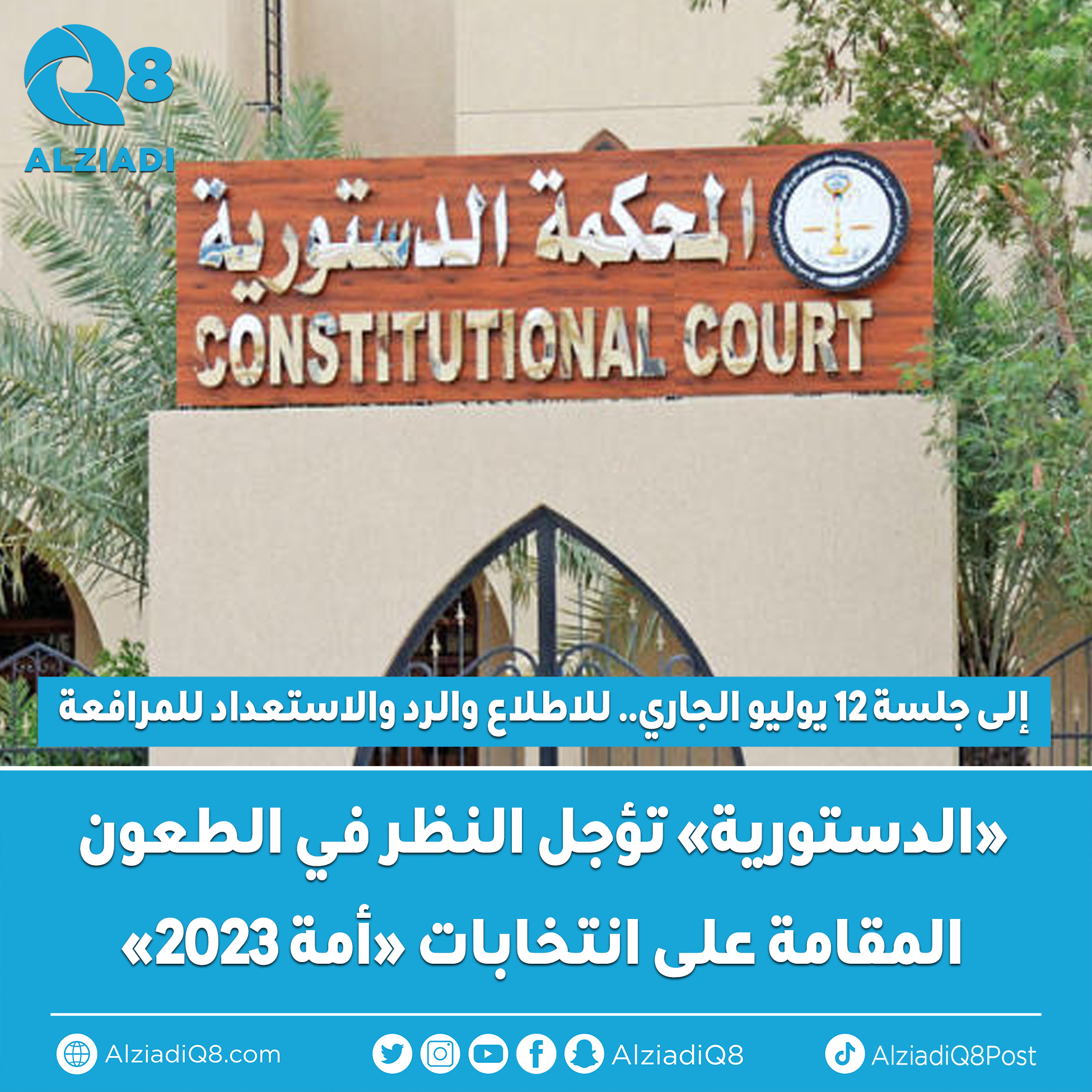 أعلنت المحكمة الدستورية اليوم الأربعاء عن تأجيل النظر في الطعون المقامة على انتخابات مجلس الأمة «أمة 2023»، إلى جلسة يوم 12 يوليو الجاري للاطلاع والرد والاستعداد للمرافعة.