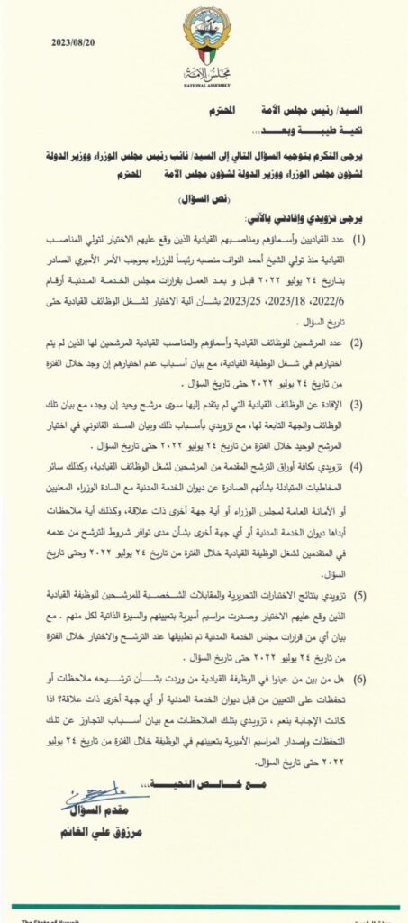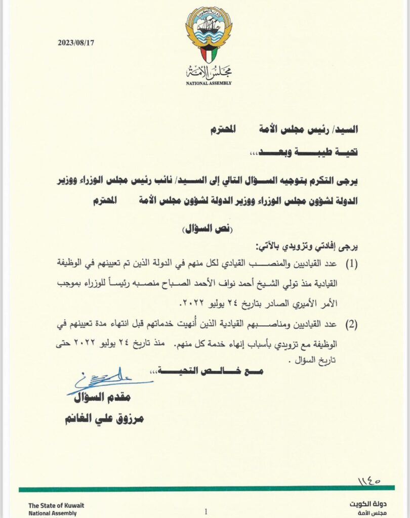 تقدمت بالأسئلة التالية فيما يتعلق بتعيين القياديين في الدولة مذكراً الأخ سمو رئيس مجلس الوزراء بواجب التأكيد على استعجال اجابة الأسئلة البرلمانية الموجهة له ولوزرائه وفقاًللقواعد و المدد الدستورية و اللائحية.