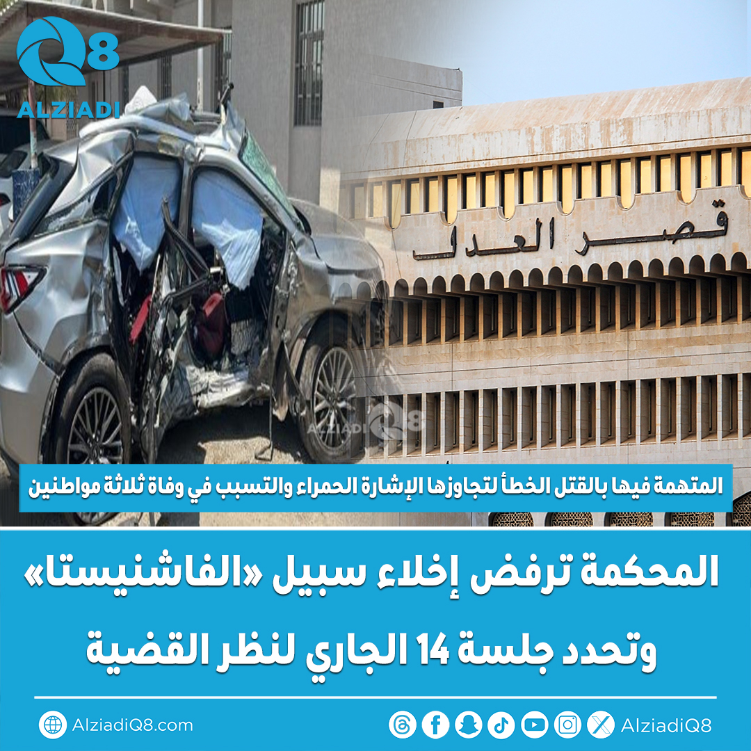 رفضت المحكمة إخلاء سبيل «الفاشنيستا» وحددت جلسة 14 الجاري لنظر القضية المتهمة فيها بالقتل الخطأ، لتجاوزها الإشارة الحمراء والتسبب في حادث ووفاة ثلاثة مواطنين.