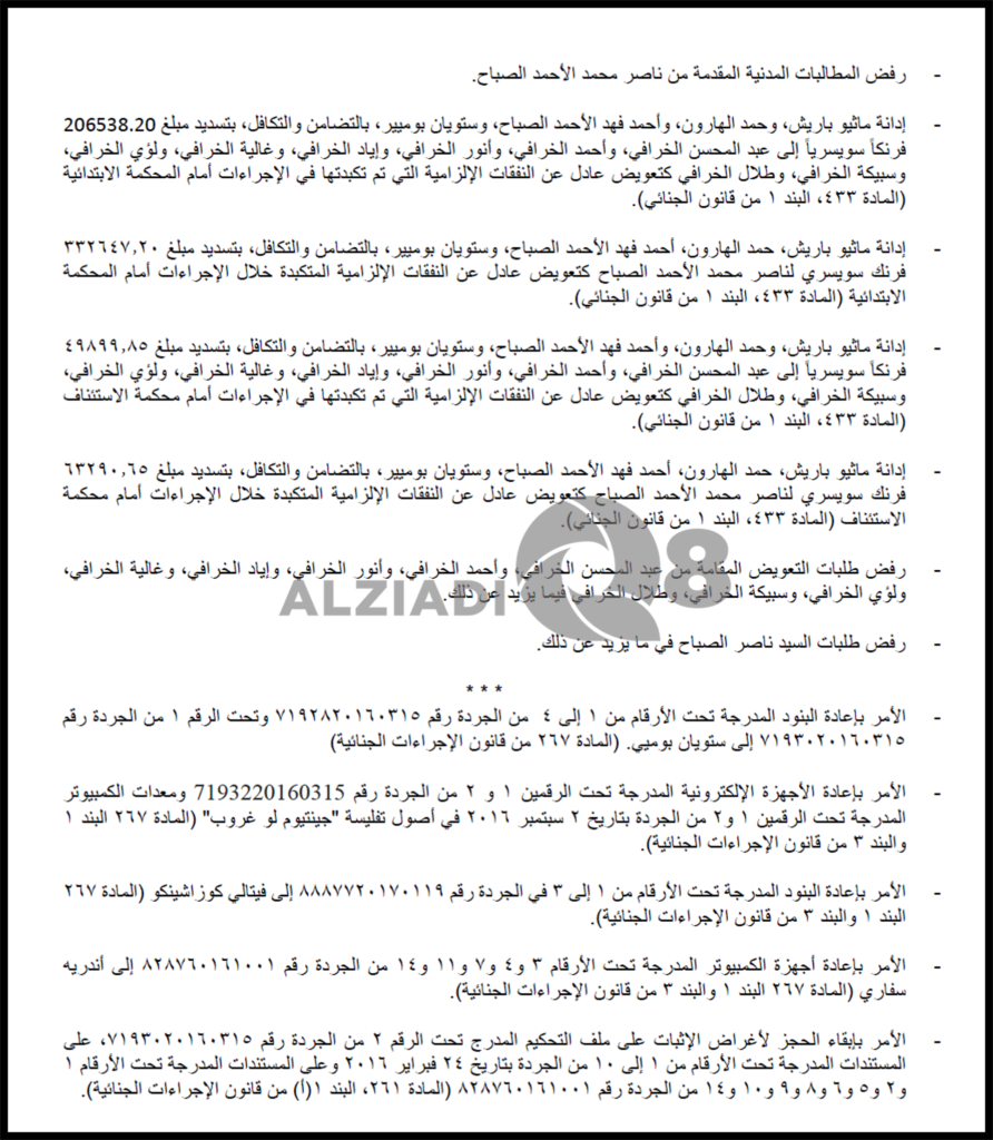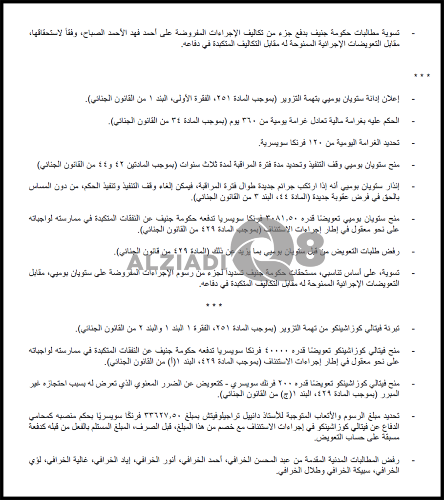 النص الكامل لـ حكم محكمة الاستئناف السويسرية و حيثيات الحكم على الشيخ أحمد الفهد و حمد الهارون