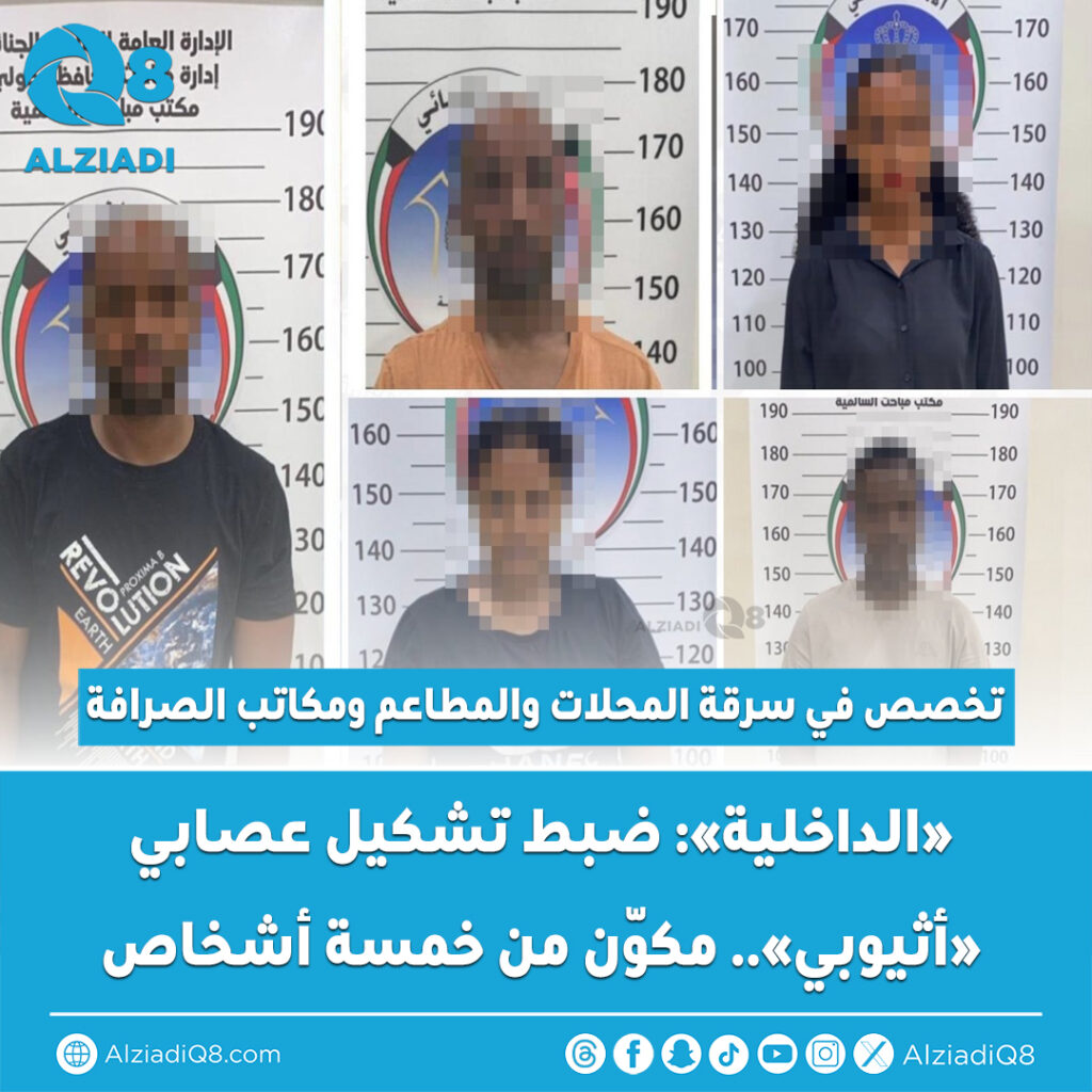 في إطار جهود وزارة الداخلية المستمرة للحد من انتشار الجريمة وضمان حفظ الأمن وضبط الخارجين على القانون، نجحت الإدارة العامة للمباحث الجنائية، ممثلة في «إدارة مباحث محافظة حولي»، في إلقاء القبض على تشكيل عصابي مكوّن من خمسة أشخاص من الجنسية الأثيوبية، تخصصوا في سرقة المحلات التجارية والمطاعم ومكاتب الصرافة.