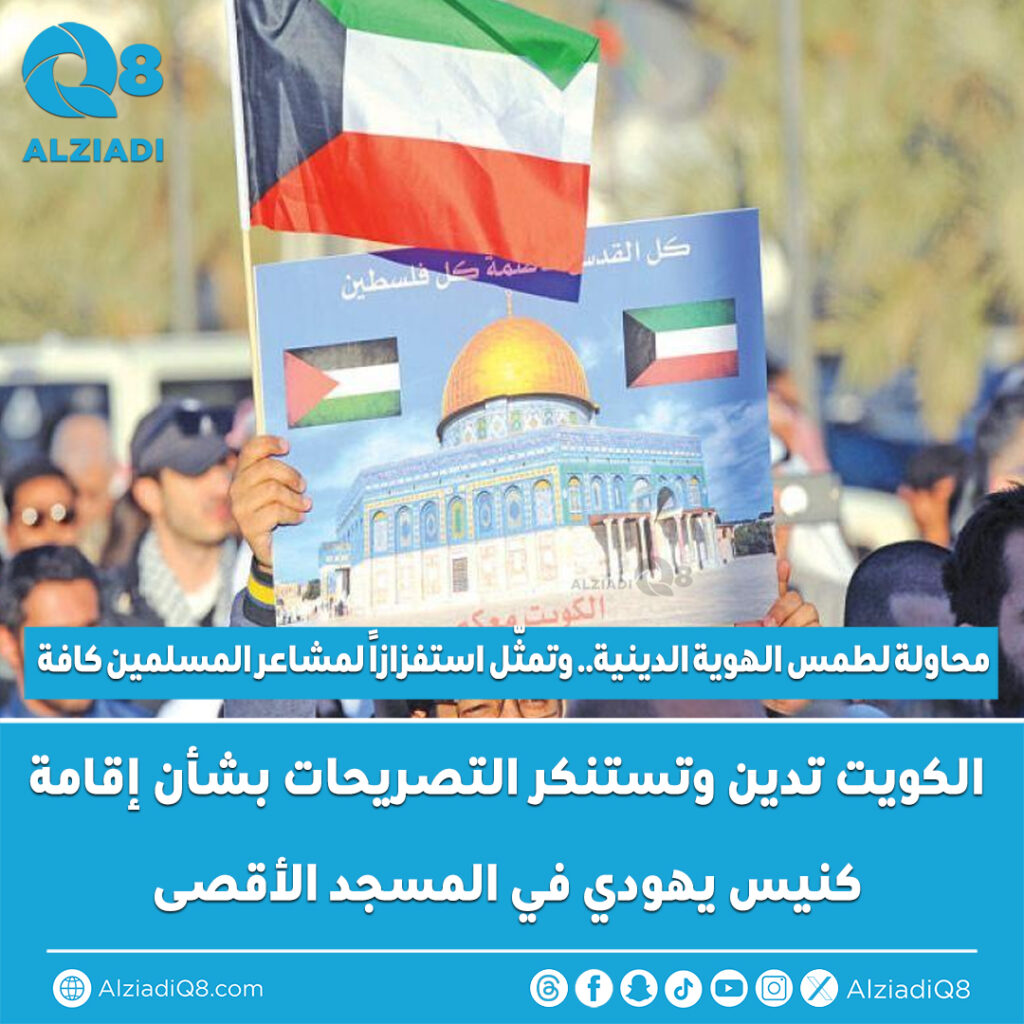 أعربت دولة الكويت عن إدانتها واستنكارها لتصريحات أحد الوزراء في حكومة الاحتلال الإسرائيلي، بشأن إقامة كنيس يهودي في المسجد الأقصى، في محاولة لطمس الهوية الدينية والوضع القانوني للحرم القدسي الشريف.