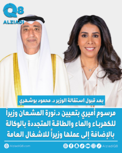 مرسوم أميري بتعيين د.نورة المشعان وزيراً للكهرباء والماء والطاقة المتجددة بالوكالة بالإضافة إلى عملها وزيراً للاشغال العامة
