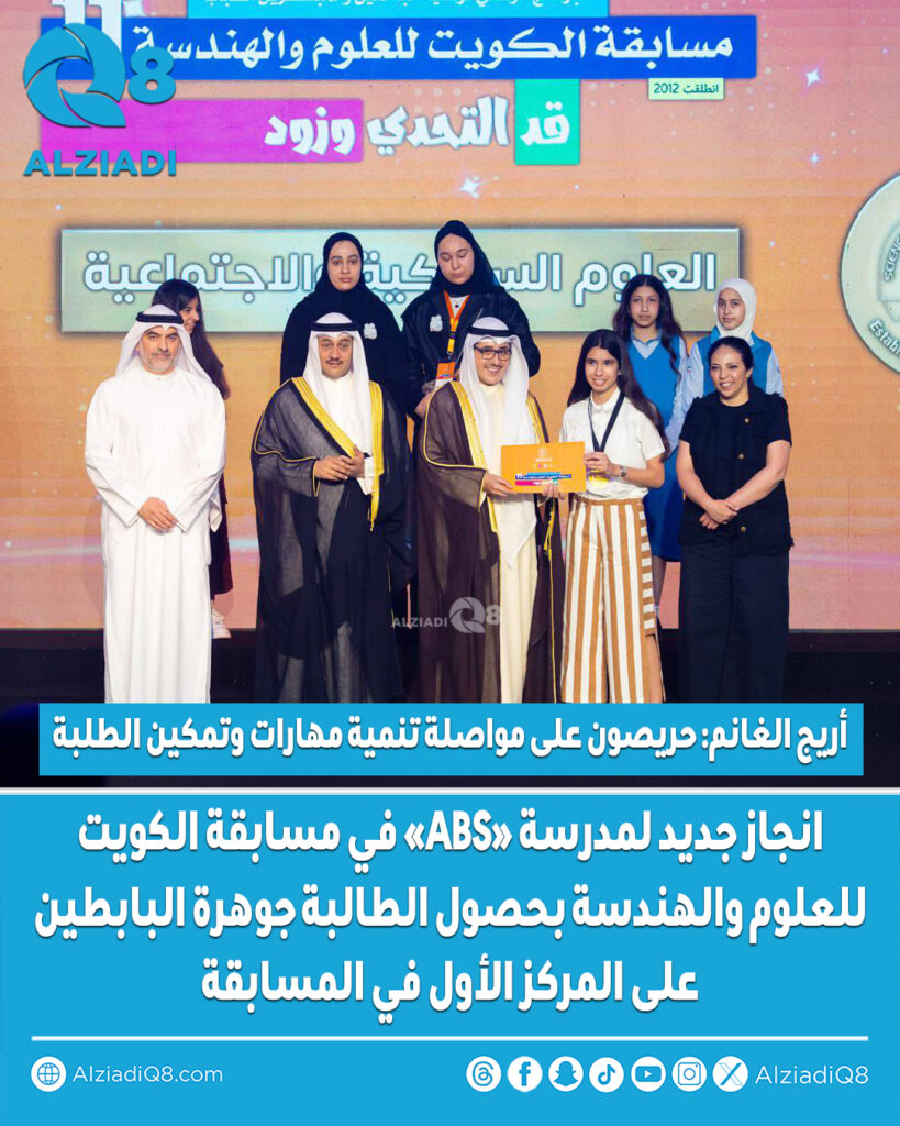 أضافت الطالبة جوهرة البابطين إنجازًا جديدًا إلى سجل مدرسة «ABS» بعد حصولها على المركز الأول في مجال العلوم السلوكية، ضمن فعاليات النسخة الحادية عشرة من مسابقة الكويت للعلوم والهندسة، التي ينظمها النادي العلمي الكويتي.