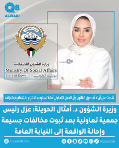 وزيرة الشؤون د. أمثال الحويلة: عزل رئيس جمعية تعاونية بعد ثبوت مخالفات جسيمة وإحالة الواقعة إلى النيابة العامة