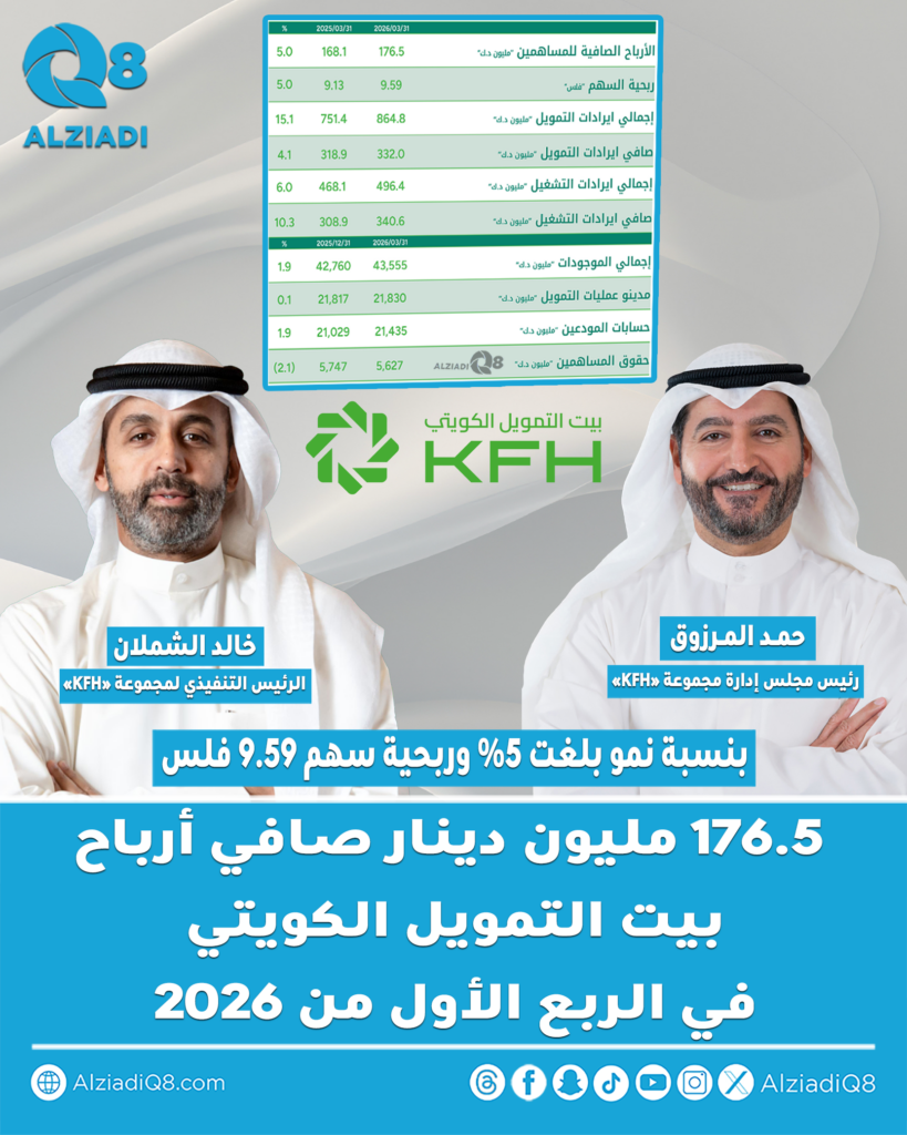 176.5 مليون دينار صافي أرباح المساهمين في بيت التمويل الكويتي خلال الربع الأول من 2026 .. بنسبة نمو بلغت 5% وربحية سهم 9.59 فلس