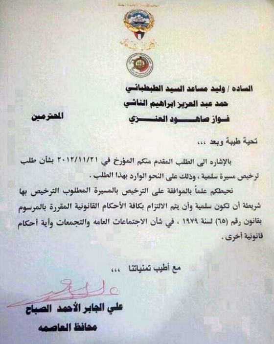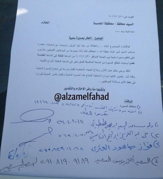 تقدم كل من: وليد الطبطبائي – عمار العجمي – حمد الناشي – سعيد السعيد بتقديم اخطار الى محافظة العاصمة لإبلاغ وزارة الداخلية عن موعد ومكان اقامة مسيرة كرامة وطن الثالثة:
