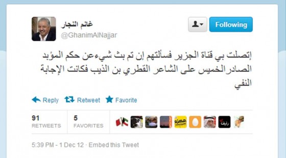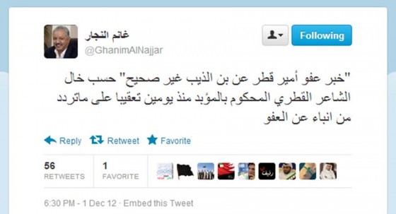 ويُذكر أن الدكتور غانم النجار قد نفى خبر إطلاق سراح الشاعر بن الذيب بعفو من أمير قطر: